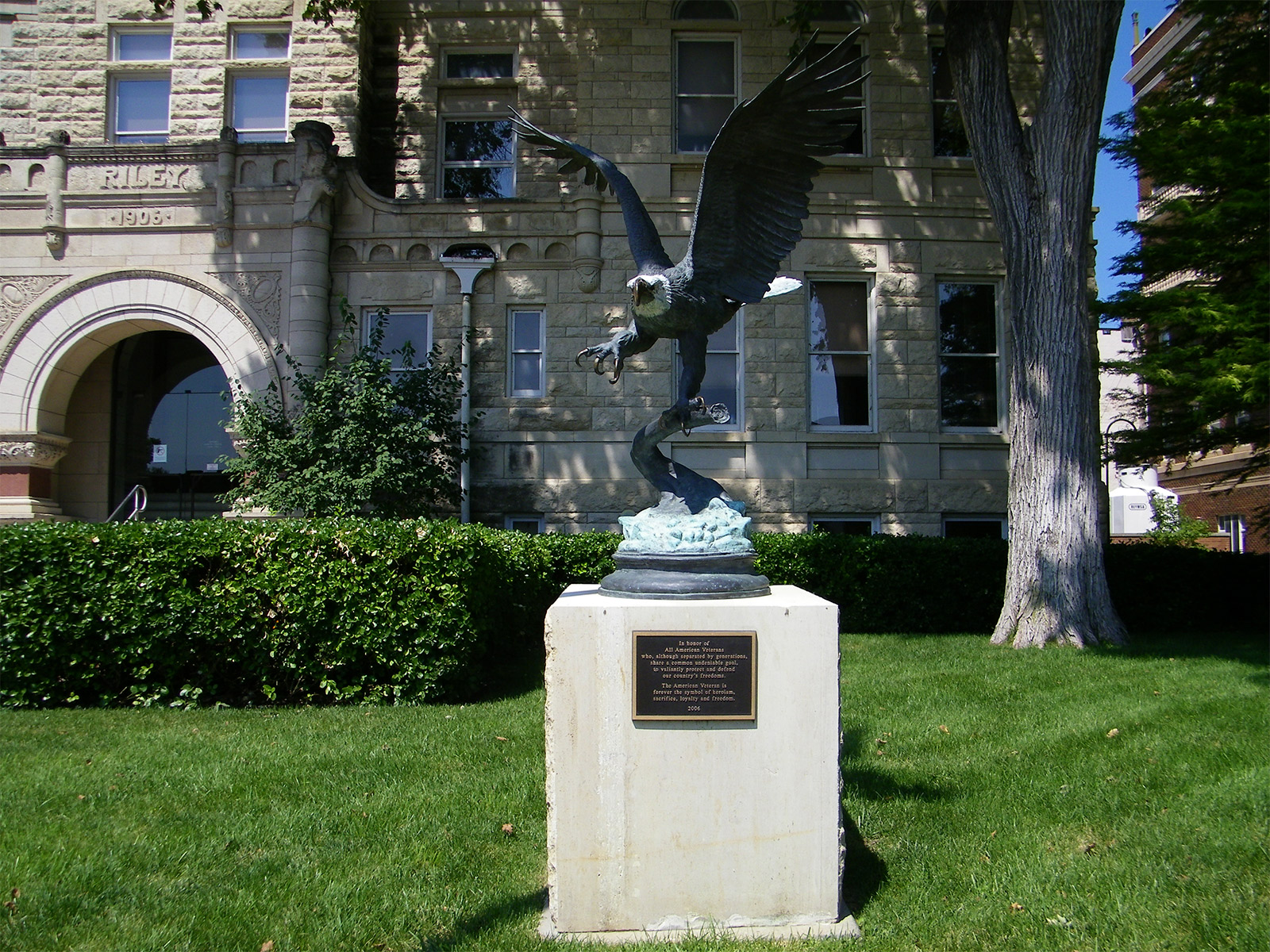 The Eagle Monument is in honor of “All American Veterans” who are “forever the symbol of heroism, sacrifice, loyalty, and freedom.” The adjacent granite monument is dedicated to “those brave individuals from Riley County who honorably served in the armed forces.”