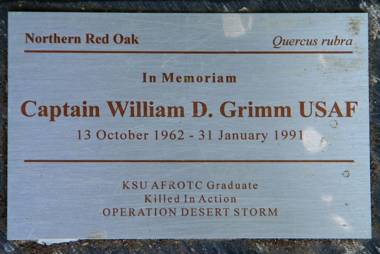 It consists of a memorial oak tree and plaque. It was dedicated in 1991 as a memorial to Capt. William D. Grimm, a member of the U.S. Air Force who was killed in action during Operation Desert Storm. Grimm graduated from the university in 1986 and is the only graduate killed during the war.