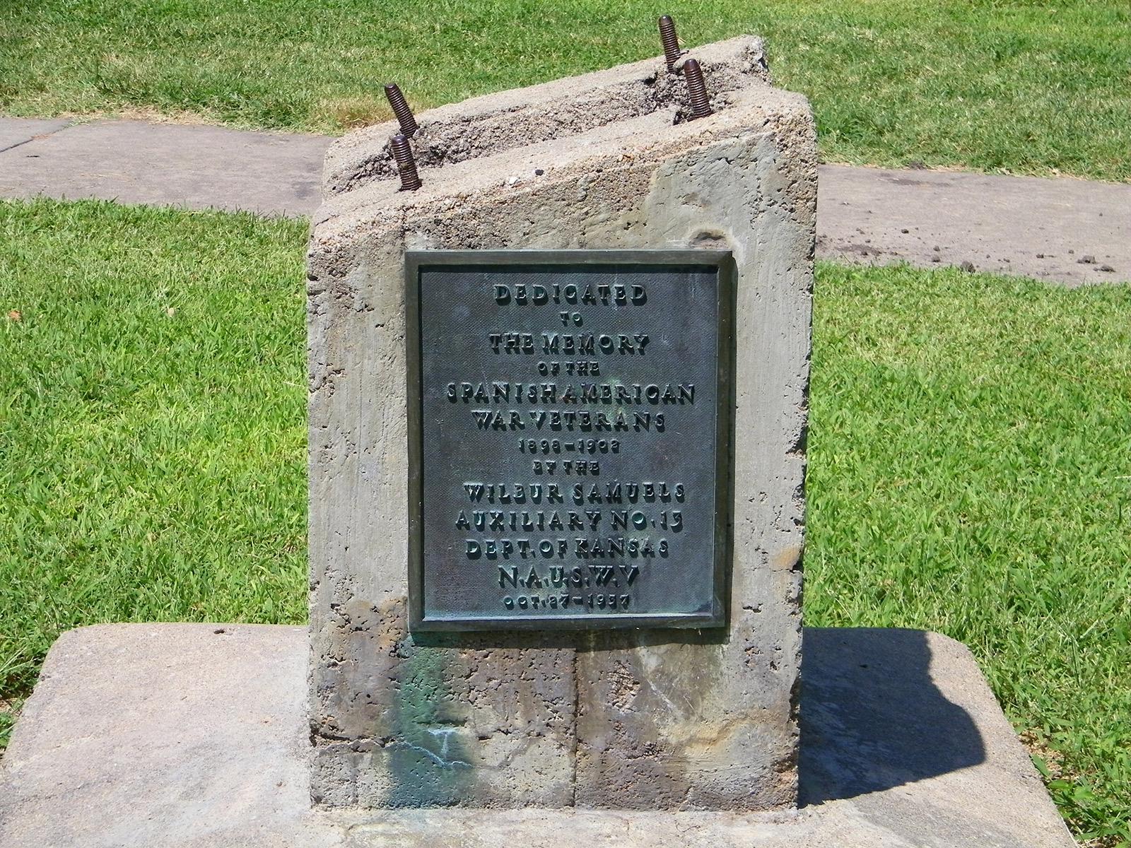 The north mount has a bronze plate that reads, "Dedicated to the memory of the Spanish American War Veterans 1898-1902 by the Wilbur Samuels Auxiliary No. 13 Dept. of Kansas N.A.U.S.W.V. Oct 27 - 1937.”