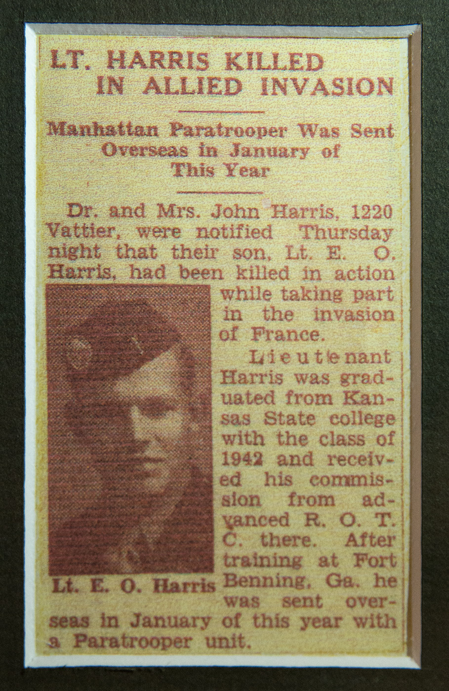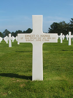 Ernest O. Harris won the Distinguished Service Cross for his actions that night. Tragically, Ernest died just six days later, in the fight to take the key town of Carentan. He is buried in the land he fought to save, in the Normandy American Cemetery at Colleville-sur-Mer, France. Riley County honors the sacrifice of a man who “fought like thirty men.”