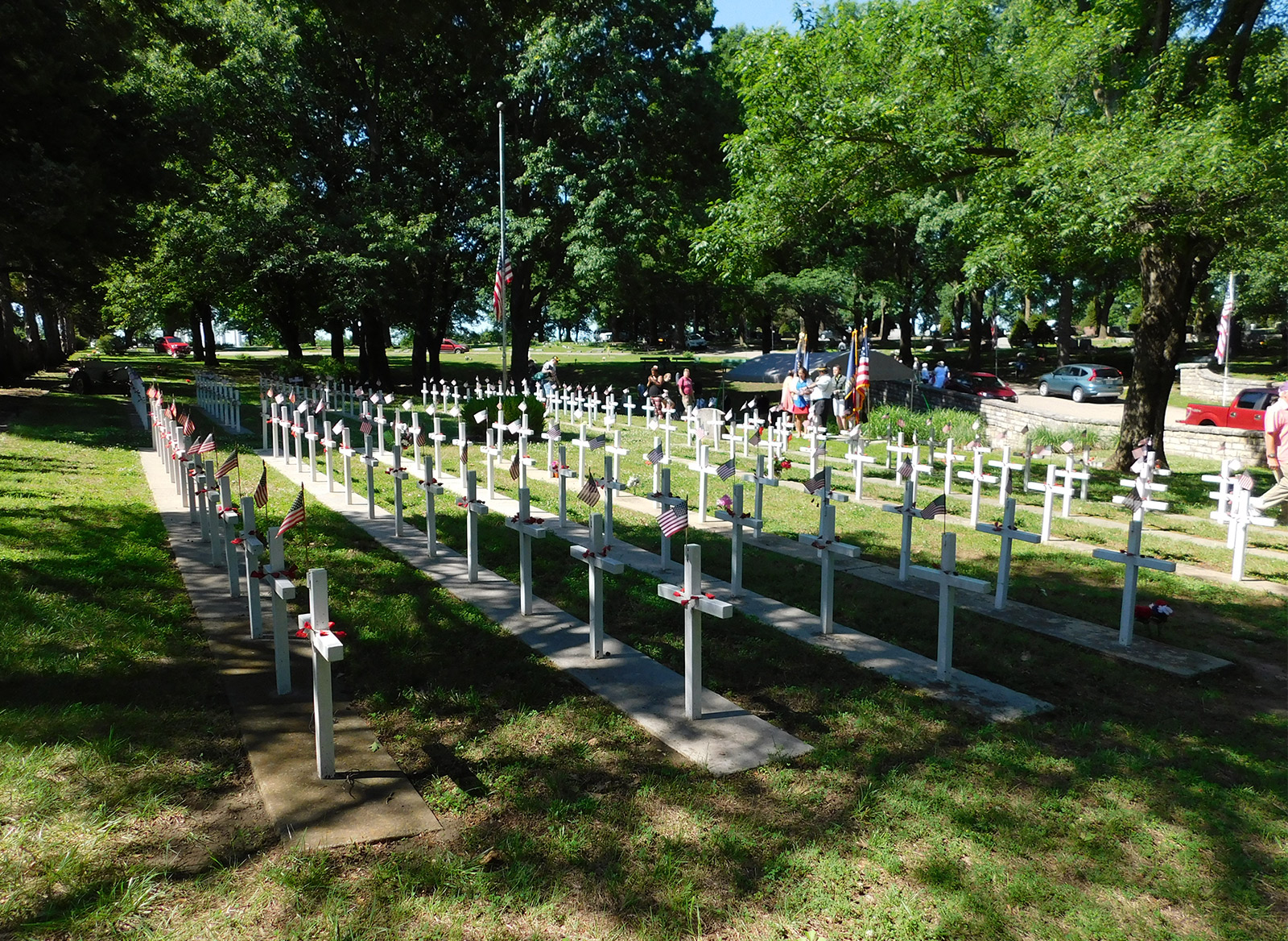 The American Legion War Memorial is a platform and includes a group of crosses that list America’s wars from the American Revolution to the present. The crosses commemorate the Revolutionary War, the War of 1812, the Mexican War, the Civil War, the Spanish-American War, World War I, World War II, Korean Conflict, Vietnam, Grenada/Lebanon, Panama, Desert Storm, Buried at Sea, and Missing and Unknown.