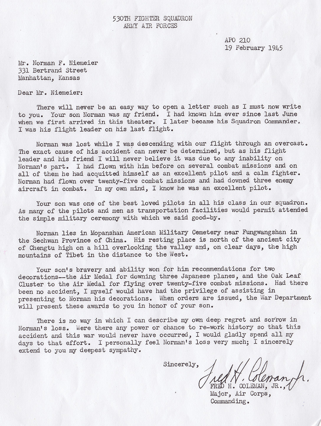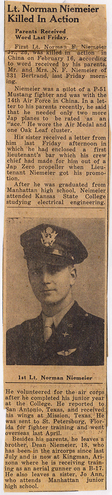 Place of Death: Plane seems to had a fatal malfunction occur causing Niemeier to crash on return from combat mission somehwere over China.
