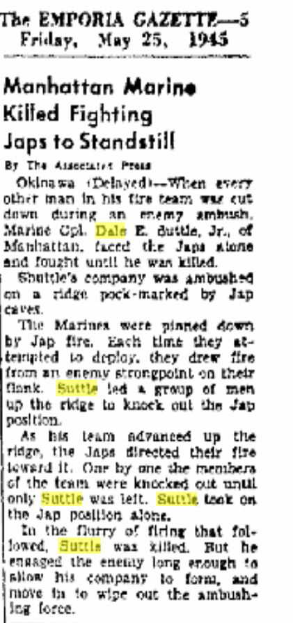 Bio: Okinawa (Delayed) - when every other man in his fire team was cut down during an enemy ambush, Marine Cpl Dale E Suttle Jr, of Manhattan, faced the Japs alone and fought until he was killed. Suttle's company was ambushed on a ridge pock-marked by Jap caves.